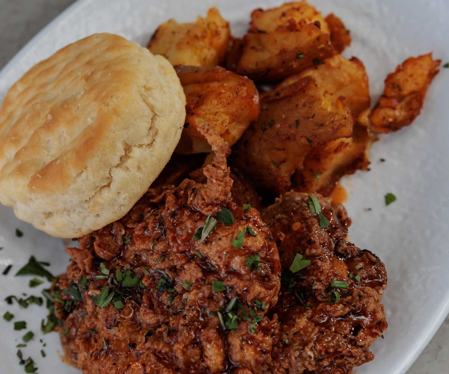 13 May 2025 Chicken & Biscuits Butter Milk Fried Chicken Thigh, Hot Garlic Honey, Biscuits, Served with Smashed Potatoes adminmaverick